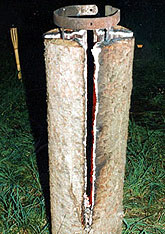 Trockener, runder Nadelholzblock, der kreuzförmig 3/4 eingeschnitten ist (je nach ø des Feuers 2-4 Schnitte); mit Hilfe eines Anzünders brennt das Holz langsam von oben in sich herunter. Der Anzünder ist in der Lieferung enthalten.